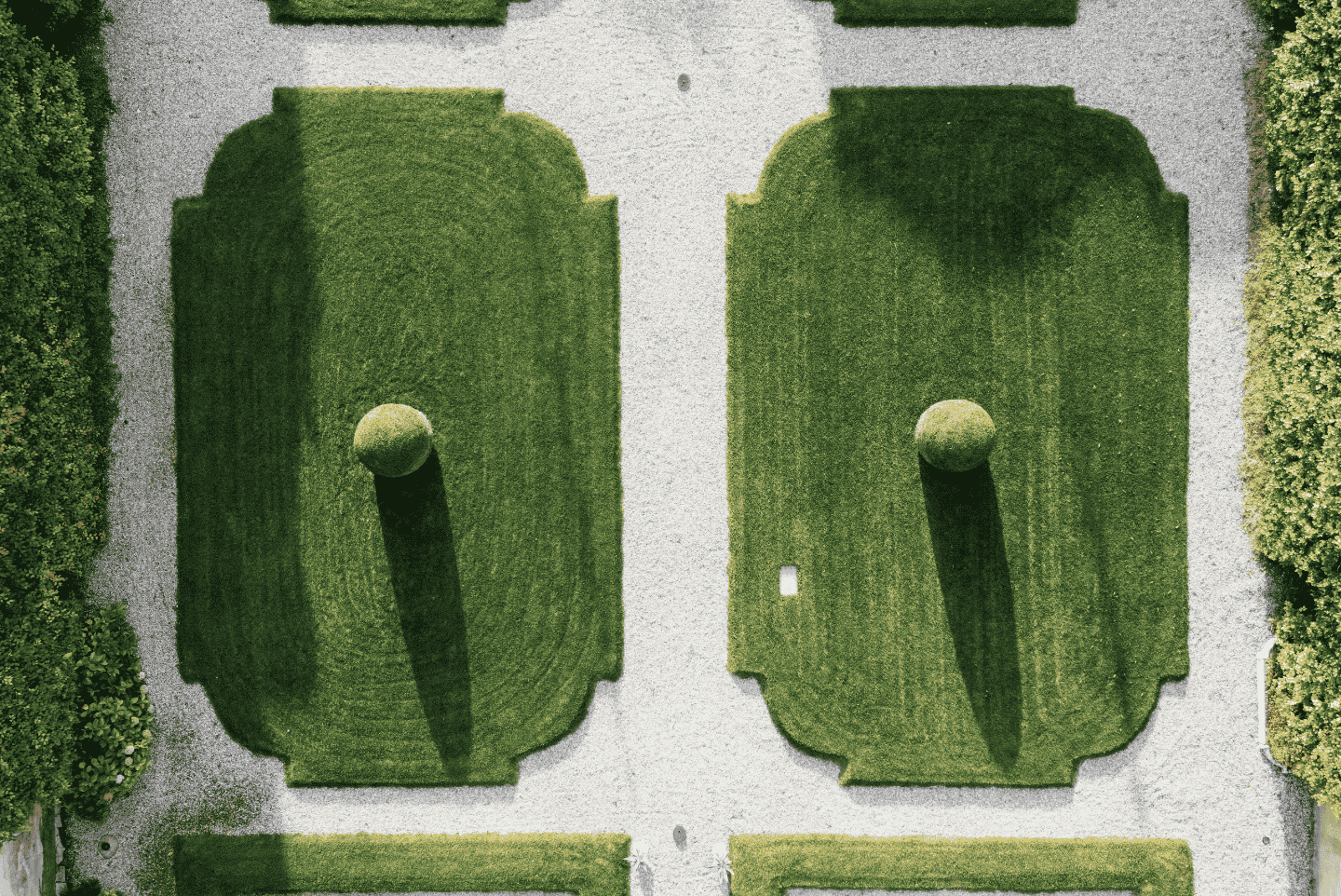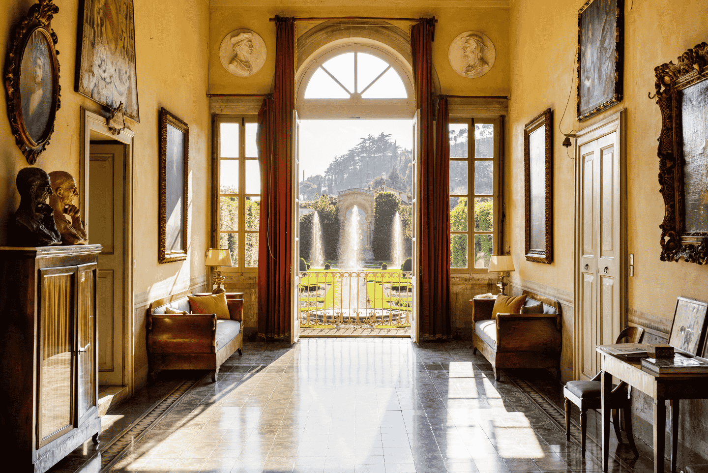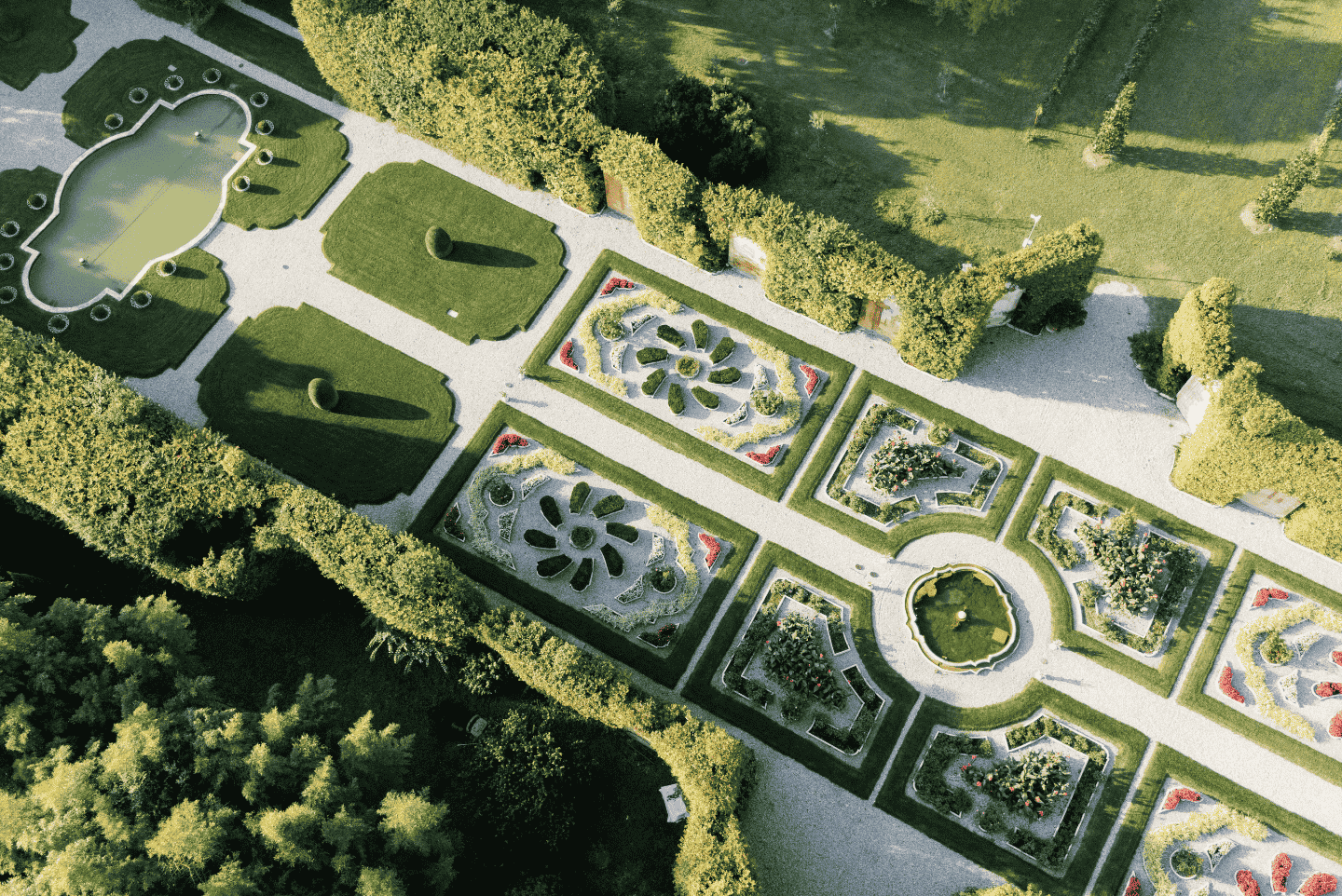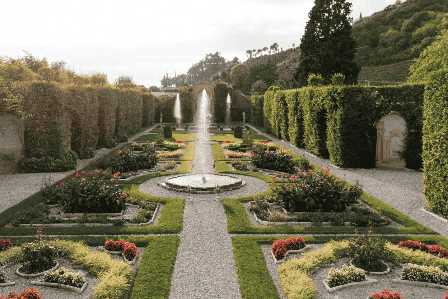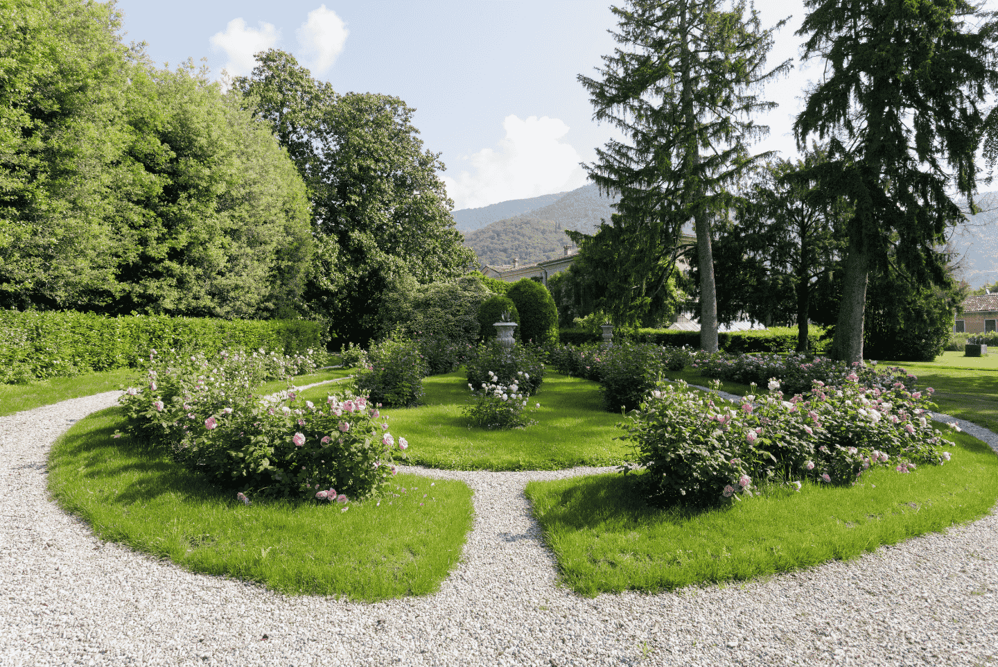 Numerose varietà di rose nel Parco all’Inglese, un uliveto storico, il frutteto e la presenza unica in un giardino di 17 trompe-l’oeil affrescati tra il XVIII ed il XIX secolo. In maggio le rose sono al culmine della fioritura; in ottobre i giardini ospitano un Festival di musica antica a testimoniare la vocazione musicale di questo luogo.